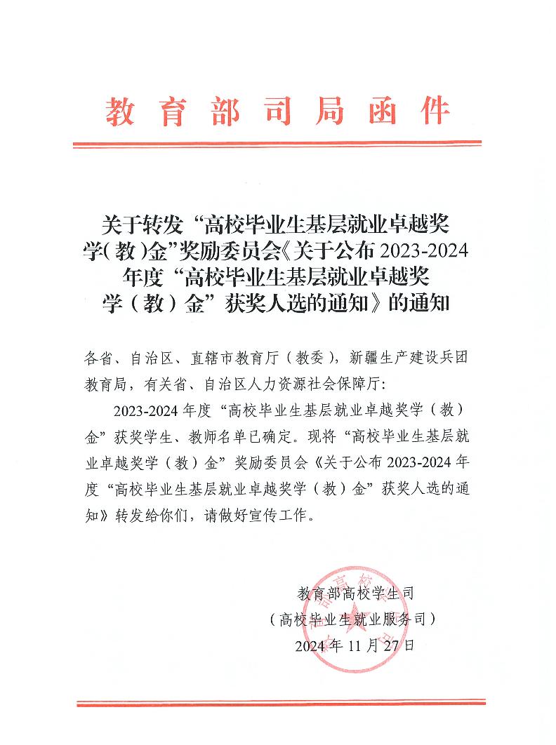 “高校畢業(yè)生基層就業(yè)卓越獎學(教)金”項目由教育部高校學生司(高校畢業(yè)生就業(yè)服務(wù)司)、教育部學生服務(wù)與素質(zhì)發(fā)展中心共同指導,旨在貫徹落實黨中央、國務(wù)院關(guān)于引導和鼓勵高校畢業(yè)生到基層就業(yè)的決策部署,獎勵赴基層就業(yè)創(chuàng)業(yè)并作出突出業(yè)績的普通高校畢業(yè)生和普通高校指導服務(wù)大學生赴基層就業(yè)工作有突出貢獻的教師。