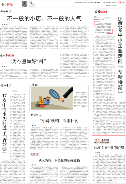 梁學(xué)平:中小企業(yè)體量雖小,潛力卻不小。它們不僅是經(jīng)濟(jì)增長(zhǎng)的動(dòng)力,也是社會(huì)穩(wěn)定的基石。從生產(chǎn)角度看,中小企業(yè)是社會(huì)最為活躍、最具潛力的創(chuàng)新主體。在一些細(xì)分領(lǐng)域,有的中小企業(yè)瞄準(zhǔn)一條賽道深耕多年,獨(dú)具優(yōu)勢(shì),其中不乏突破“卡脖子”技術(shù)的“小巨人”、單項(xiàng)冠軍等。在日常生活中,中小企業(yè)能滿(mǎn)足消費(fèi)者個(gè)性化、多樣化需求,提高居民生活品質(zhì)。尤其在促進(jìn)就業(yè)上,中小企業(yè)數(shù)量眾多、分布領(lǐng)域廣,能吸納大量不同層次的勞動(dòng)力,同時(shí),成為創(chuàng)新創(chuàng)業(yè)的重要陣地。在天開(kāi)高教科創(chuàng)園,有不少初創(chuàng)企業(yè)由高校科研團(tuán)隊(duì)建立,它們體量不大,卻天生帶有科技基因,是成長(zhǎng)為“專(zhuān)精特新”企業(yè)的重要力量。