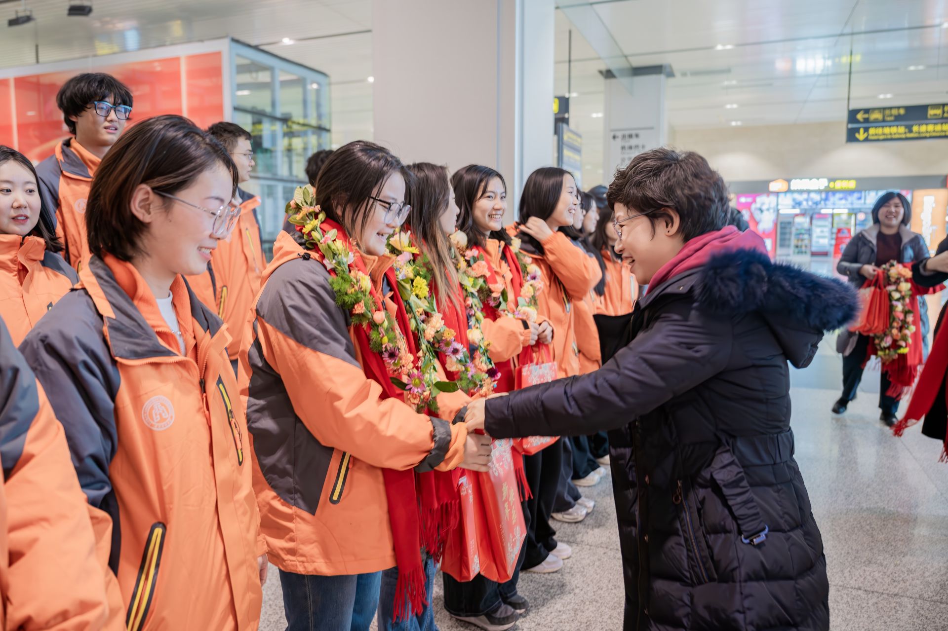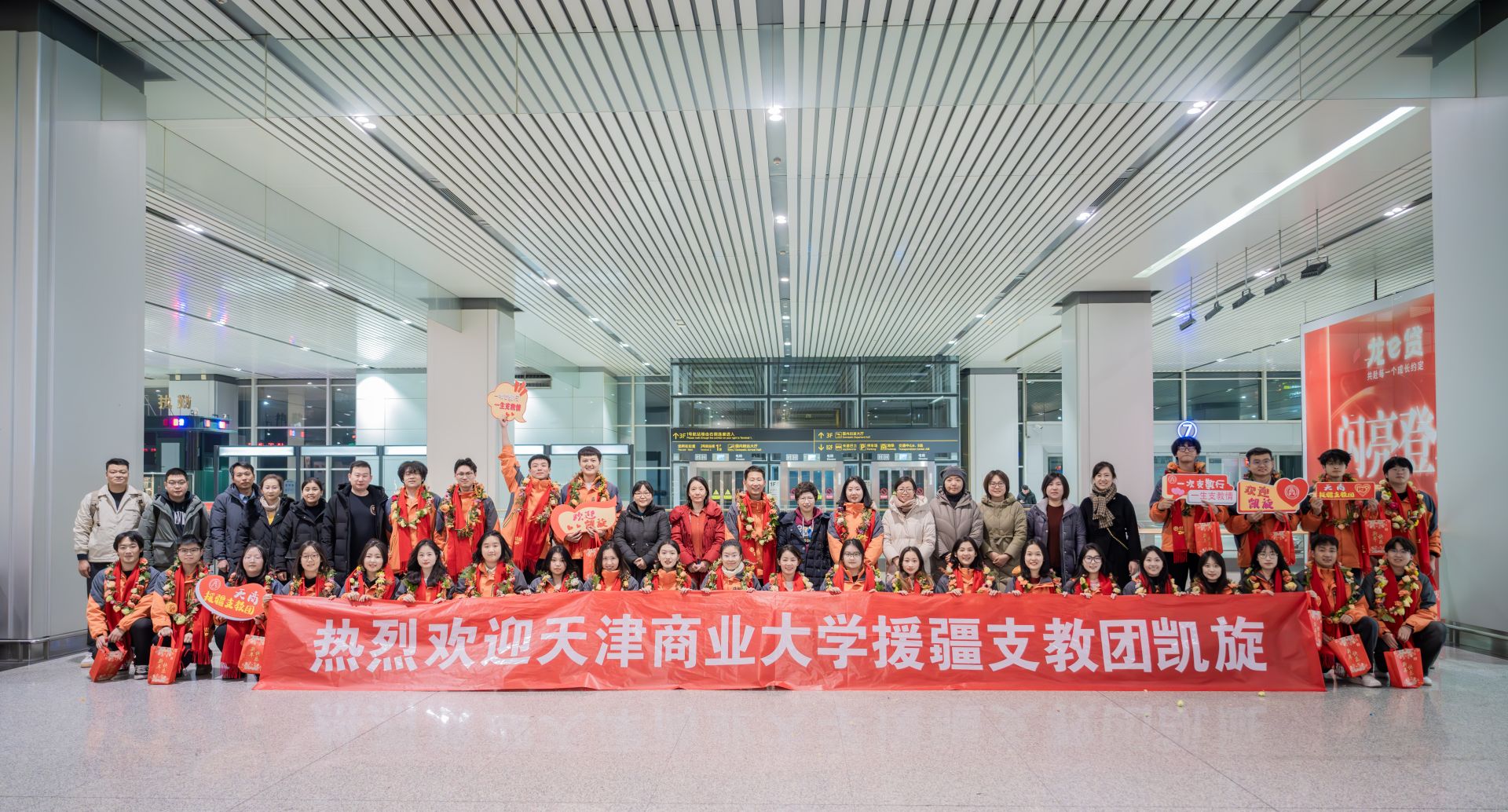 機場大廳,“熱烈歡迎天津商業大學援疆支教團凱旋”的橫幅格外醒目,王立云與支教團師生熱情握手,為他們戴上鮮花花環和具有天商元素的紅圍巾,送上“致天津商業大學援疆支教團師生的一封信”和精美禮物,在簡短而溫馨的接機儀式中,她向支教團師生凱旋致以最崇高的敬意和最衷心的感謝;對支教團三個半月的出色工作給予充分的肯定;在新年即將到來之際,向支教團師生送上新年祝福。
