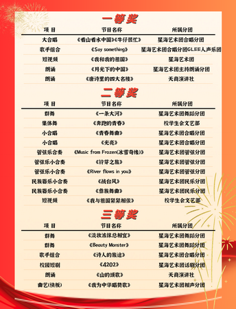 學校貫徹落實市教育兩委關于美育浸潤工作的要求,依托星海藝術團創作校園文化藝術節目,今年學校21項作品在天津市美育課堂文藝展演中取得優異成績,其中獲得一等獎5項,二等獎10項,三等獎6項。學校將持續加強美育工作,打造美育精品活動,奮力譜寫新時代美育發展新篇章。(審稿:王櫻潔)