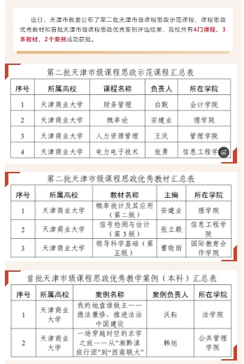 學(xué)校黨委堅持把課程思政建設(shè)擺在學(xué)校工作的重要位置,構(gòu)建黨委統(tǒng)一領(lǐng)導(dǎo)、部門協(xié)同聯(lián)動、院系層層落實推進的課程思政建設(shè)工作格局。扎實推進課程思政“133”建設(shè)工程,制定出臺《天津商業(yè)大學(xué)課程思政建設(shè)實施方案》《思想政治理論課課程群相關(guān)課程開設(shè)方案》。實施“課程思政示范課程”“‘三全育人’課程思政研究專項”及“思想政治理論課教育教學(xué)研究專項” 校級項目建設(shè)工作,推動跨學(xué)院、跨學(xué)科、跨專業(yè)、跨課程開展思政課教學(xué)研究,促進思政課程與課程思政同向同行。建立課程思政資源庫,以課程、典型案例等為抓手,樹立課程思政教學(xué)標(biāo)桿,發(fā)揮優(yōu)質(zhì)課程思政資源的輻射作用。五年來累計立項13門市級課程思政示范課,獲批首批天津市課程思政優(yōu)秀案例(本科)2個,立項建設(shè) 163門校級課程思政示范課,覆蓋全校所有專業(yè),形成“院院有精品、門門有思政、課課有特色、人人重育人”良好局面。