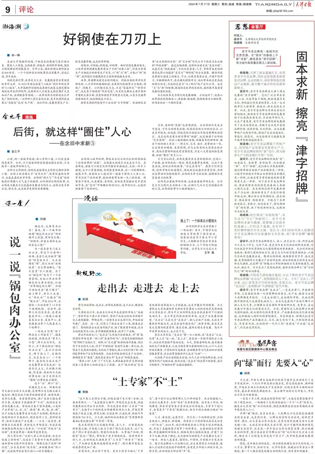 7月17日,我校經濟學院院長梁學平教授做客《天津日報》9版思想會客廳欄目,就“固本求新 擦亮‘津字招牌’”話題,與日報評論員開展對話。他指出,老字號老品牌是天津工商業發展的“金字招牌”。它們廣泛分布在食品、工業、文旅等各個領域,既扮演著歷史文化、傳統技藝傳承者的角色,又是一支為城市引入新場景、新技術、新業態的生力軍。而且,老字號老品牌與百姓衣食住行密切相關,推動老字號老品牌創新發展有助于打造高品質生活,點旺城市煙火氣。