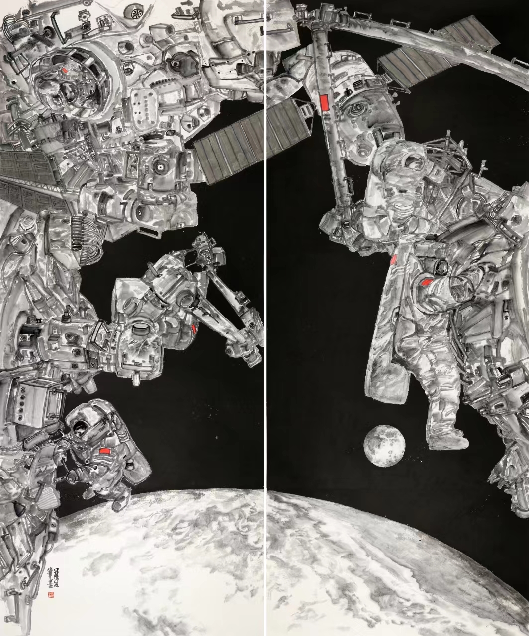 《逐夢寰宇》用富有想象力的創作手法,運用中國畫純水墨藝術形式,演繹中國航天精彩傳奇,彰顯中國載人航天事業的發展,表達了對祖國航天事業的憧憬與祝福,構筑了立志探索浩瀚宇宙的偉大“航天夢”。《逐夢寰宇》的完成,為現實題材美術創作積累了經驗,也為今后大型航天題材美術創作積累了寶貴素材。