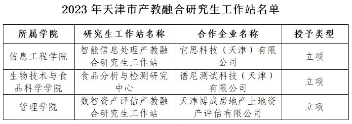近日,天津市教育委員會公布了2023年天津市產教融合研究生工作站評選結果。我校信息工程學院和它思科技(天津)有限公司共建的智能信息處理產教融合研究生工作站、生物技術與食品科學學院和譜尼測試科技(天津)有限公司共建的食品分析與檢測研究中心、管理學院和天津博成房地產土地資產評估有限公司共建的數智資產評估產教融合研究生工作站入選。