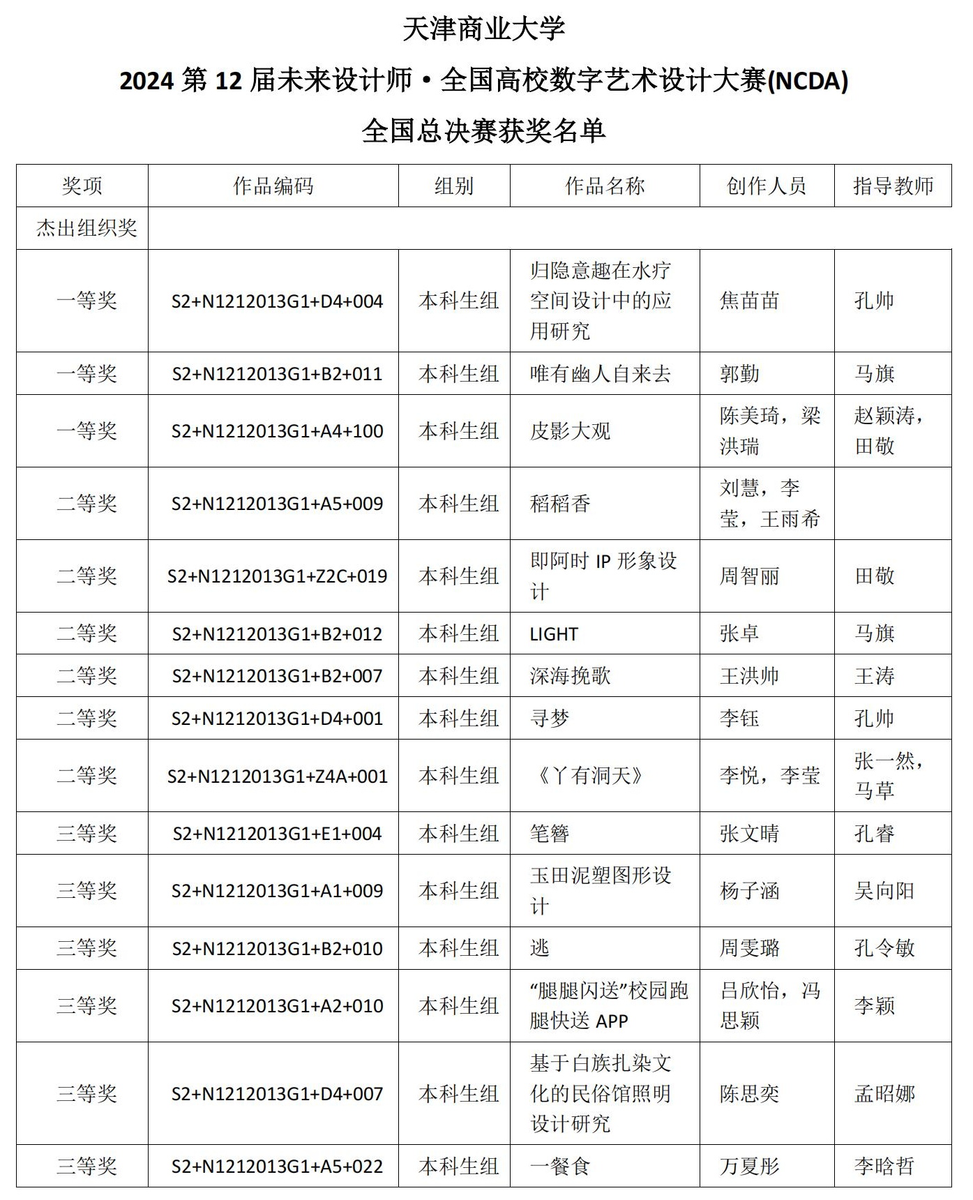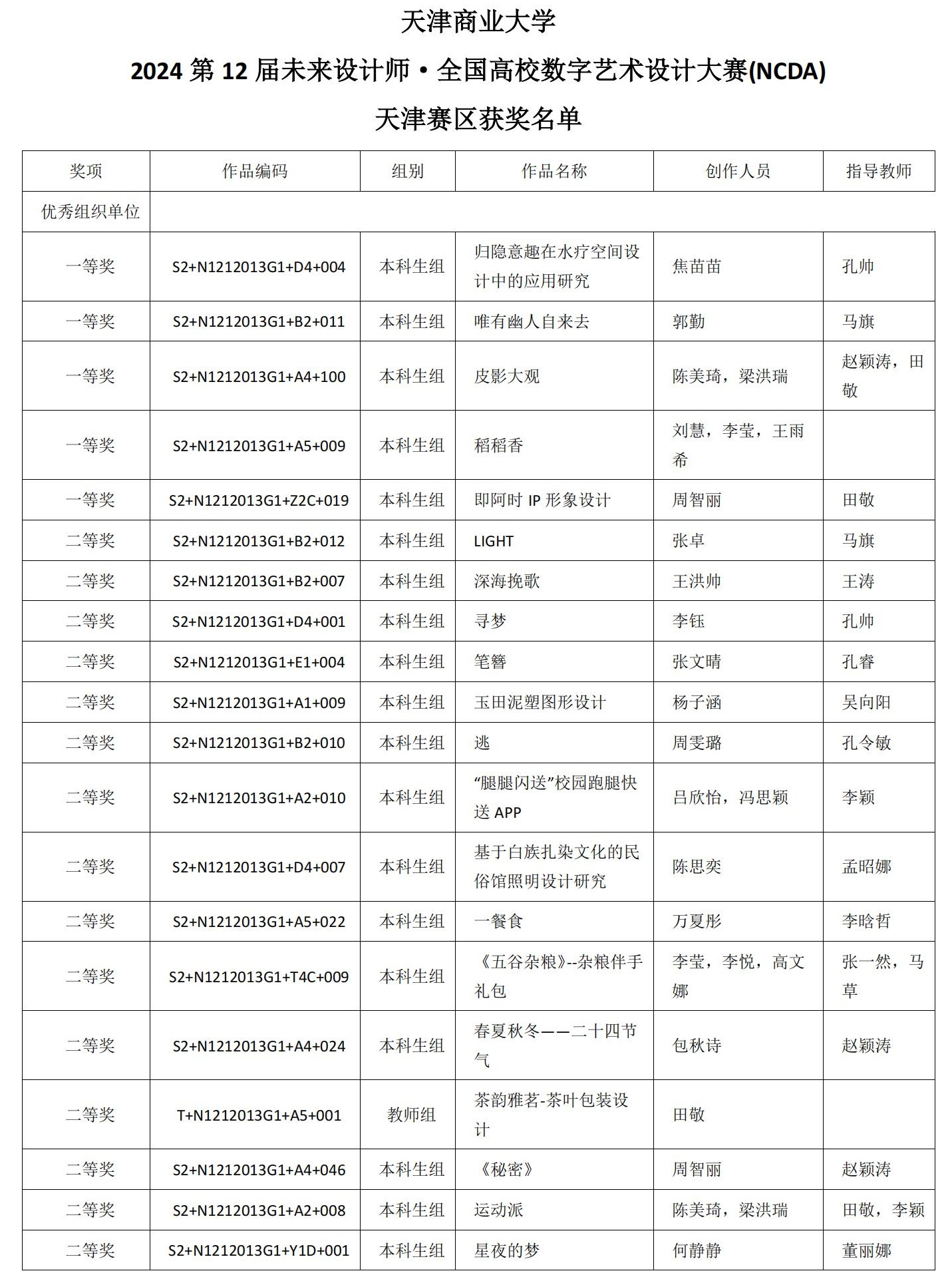 近日,2024年第十二屆未來(lái)設(shè)計(jì)師·全國(guó)高校數(shù)字藝術(shù)設(shè)計(jì)大賽(NCDA)獲獎(jiǎng)名單公布,我校藝術(shù)學(xué)院學(xué)生獲全國(guó)總決賽一等獎(jiǎng)3項(xiàng)、二等獎(jiǎng)6項(xiàng)、三等獎(jiǎng)6項(xiàng),獲天津賽區(qū)一等獎(jiǎng)5項(xiàng)、二等獎(jiǎng)15項(xiàng)、三等獎(jiǎng)19項(xiàng);學(xué)校榮獲全國(guó)總決賽“杰出組織獎(jiǎng)”,天津賽區(qū)“優(yōu)秀組織獎(jiǎng)”。