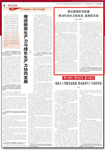 9月20日,《天津日報》(理論創(chuàng)新版)刊發(fā)我校經(jīng)濟(jì)學(xué)院孫云鵬副教授、副校長陳冠益教授理論文章《抓住能源轉(zhuǎn)型機(jī)遇 推動經(jīng)濟(jì)社會綠色化、低碳化發(fā)展》。文章指出,要加快實(shí)現(xiàn)生產(chǎn)生活方式綠色變革,推動經(jīng)濟(jì)社會發(fā)展建立在資源高效利用和綠色低碳發(fā)展的基礎(chǔ)之上。積極穩(wěn)妥推進(jìn)碳達(dá)峰碳中和,需要不斷加快推進(jìn)能源消費(fèi)方式變革,不斷探索規(guī)劃建設(shè)新型能源體系。