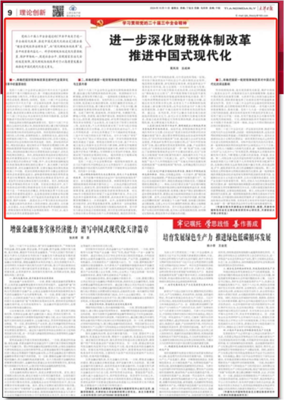 10月11日,《天津日報》(理論創新版)刊發我校副校長黃鳳羽理論文章《進一步深化財稅體制改革 推進中國式現代化》。文章指出,黨的二十屆三中全會通過的《中共中央關于進一步全面深化改革、推進中國式現代化的決定》提出要“健全宏觀經濟治理體系”,而“深化財稅體制改革”是其中的重要內容之一。科學的財稅體制是優化資源配置、維護市場統一、促進社會公平、實現國家長治久安的制度保障,深化財稅體制改革對于以高質量發展全面推進中國式現代化意義重大。