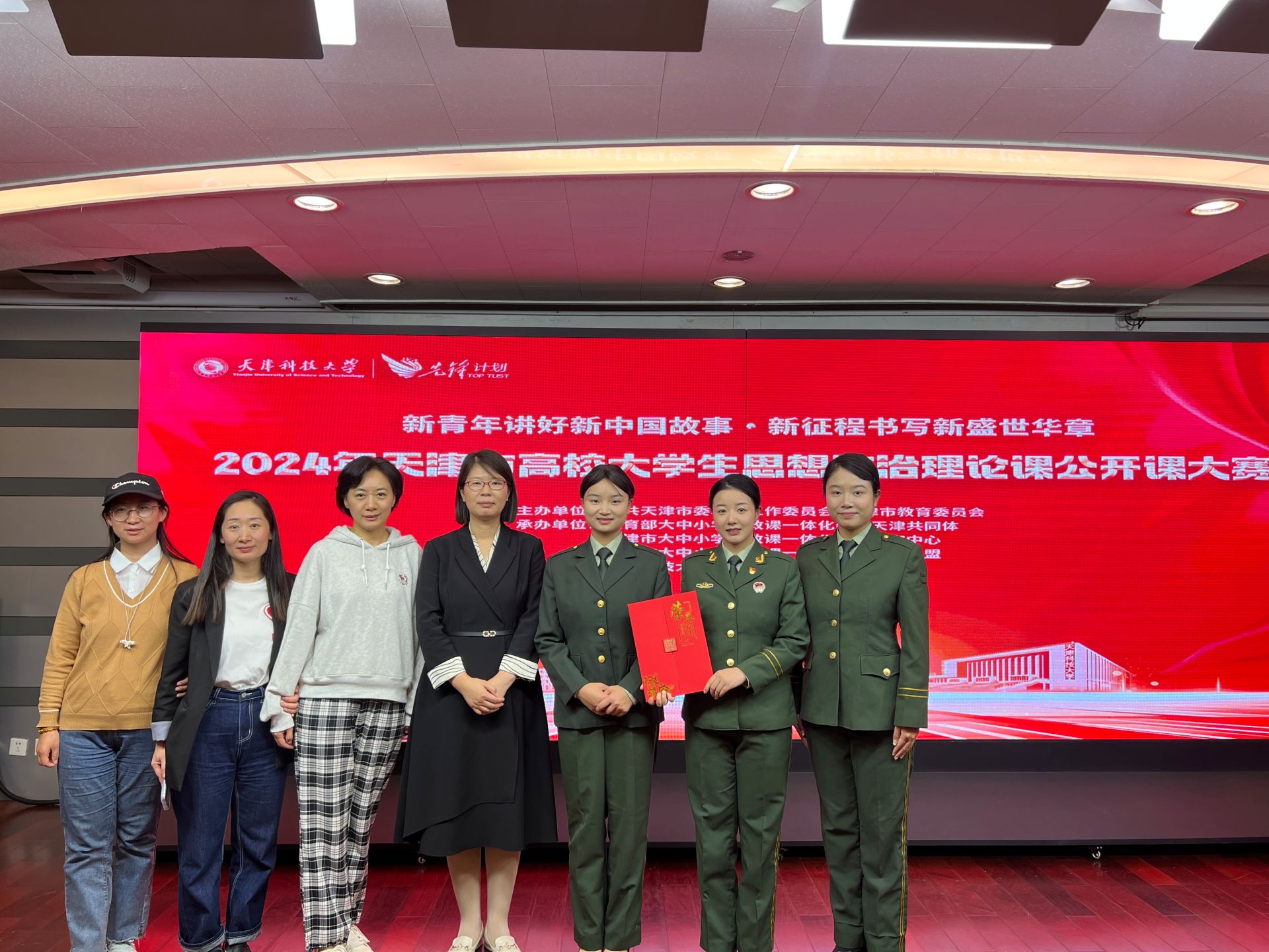本次比賽以“新青年講好新時代中國故事 新征程書寫新盛世華章”為主題,鼓勵學生結合思政課有關內容,創新講授“行走的思政課”“場館里的思政課”。經過各高校初賽、市級復賽的篩選,最終由來自天津市高校的15支團隊進入了決賽。段卓雅團隊以“青春就要熱辣滾燙”為題,以大學生的青春困惑為切入點,結合在平津戰役紀念館和天津市黨的建設與黨史故事思政課重點實驗室參觀學習的青春感悟,以實驗室故事為案例,講述了不同歷史時期的青春故事,回答了“何謂青春”“青春何為”“何以青春”這“青春三問”,并以自己參軍入伍的經歷展現了當代青年熱辣滾燙的青春模樣,呼吁新時代大學生為實現中國式現代化貢獻青春力量。課程講授緊扣主題、構思精巧、特色鮮明、氣勢如虹,得到了師生評委的高度肯定,總分排名第一,獲得一等獎。