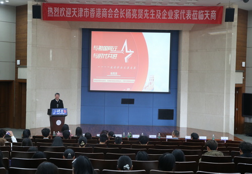 會談后,楊亮賢作客國際教育合作學院“國合大講堂”,為200多名在校生作“與祖國同行 與時代共進”的專題講座,分享了自己與天津結緣,成立天津市香港商會推動津港兩地經貿合作和文化交流方面的豐富經驗,以及幫助港商融入國家發展大局中所扮演的重要角色。