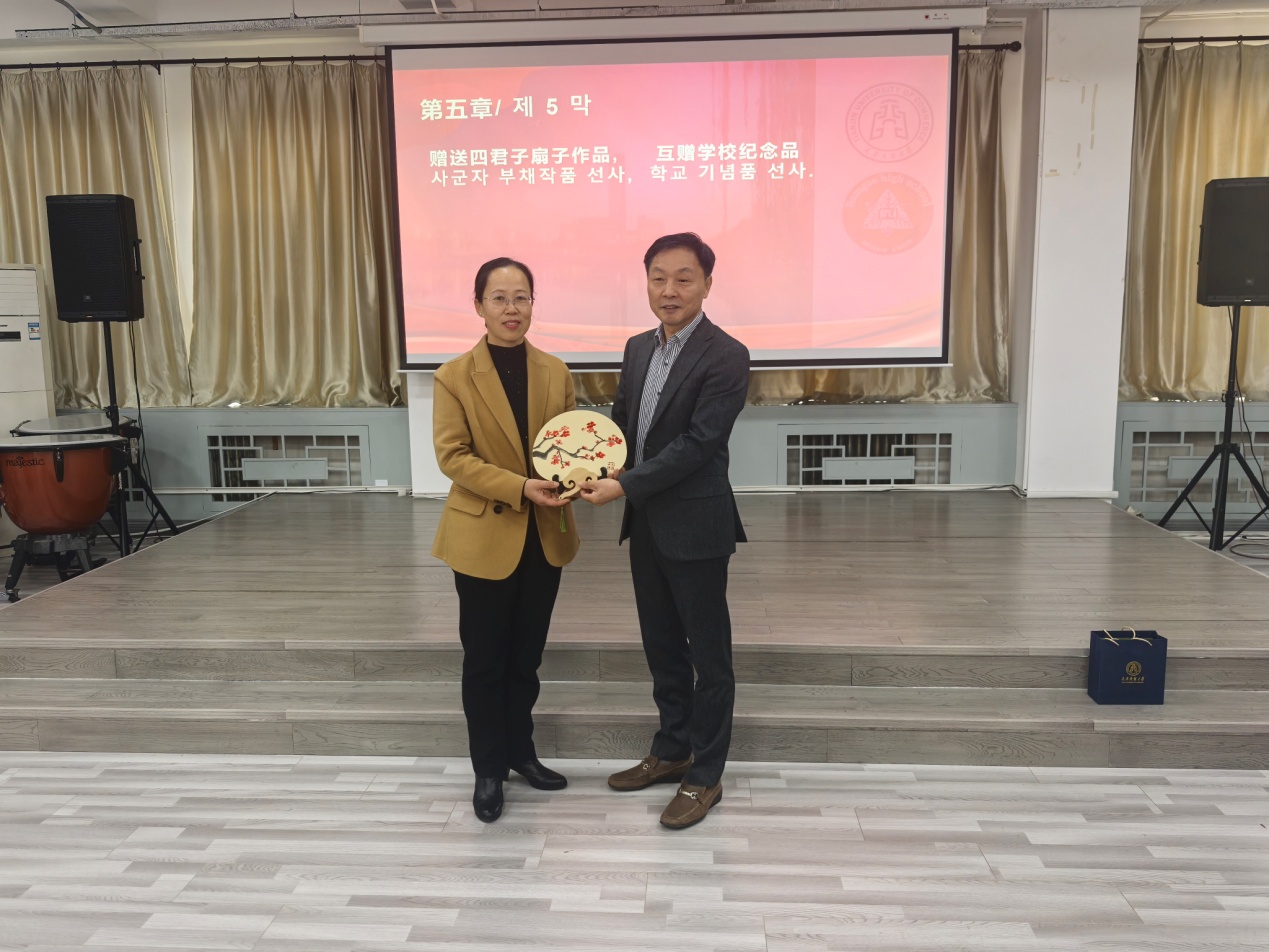 歡迎儀式上,國(guó)際教育合作學(xué)院黨委書記喬秀梅與韓國(guó)三槐高中校長(zhǎng)孔明鉉互贈(zèng)了紀(jì)念品。國(guó)際教育合作學(xué)院院長(zhǎng)曹曉麗對(duì)訪學(xué)團(tuán)的到來表示歡迎,并介紹了我校國(guó)際教育合作學(xué)院基本情況??酌縻C對(duì)天津商業(yè)大學(xué)的熱情接待表示感謝,并表達(dá)了對(duì)未來雙方深入合作的期待。在隨后的藝術(shù)交流環(huán)節(jié),中韓學(xué)生分別帶來了古箏、扇畫、歌曲、民族舞以及街舞等精彩節(jié)目。表演不僅充分展示了中韓兩國(guó)文化的獨(dú)特魅力,更傳遞了中韓學(xué)生對(duì)兩國(guó)友誼的美好祝愿和共同愿景。