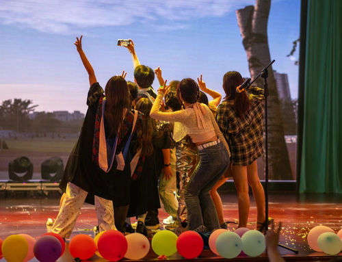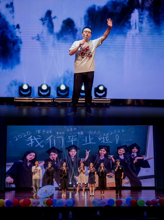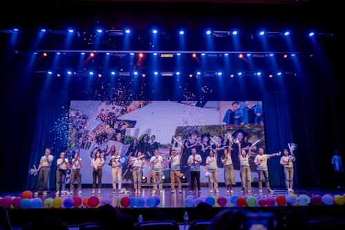 第三篇章“圓夢·奔赴山海”:舞臺劇《假如有臺時光機》以演員生動的演繹引起現場觀眾情感共鳴,表達了對校園的不舍與對未來的期許;歌曲《最炫民族風》《全是愛》《奢香夫人》《海闊天空》在旋律響起的瞬間就讓人心潮澎湃,現場沸騰燃爆,將整臺演出推向高潮。街舞串燒《Batter up》《LALALALA》,青春洋溢,活力四射;歌曲《我們都擁有海洋》表達了對別離的不舍和祝福,引起了同學們彼此間的不舍之情。最后,《放心去飛》歌聲徐徐響起,由13個學院團委書記和輔導員老師代表演唱,表達了對畢業生同學們的衷心祝福。