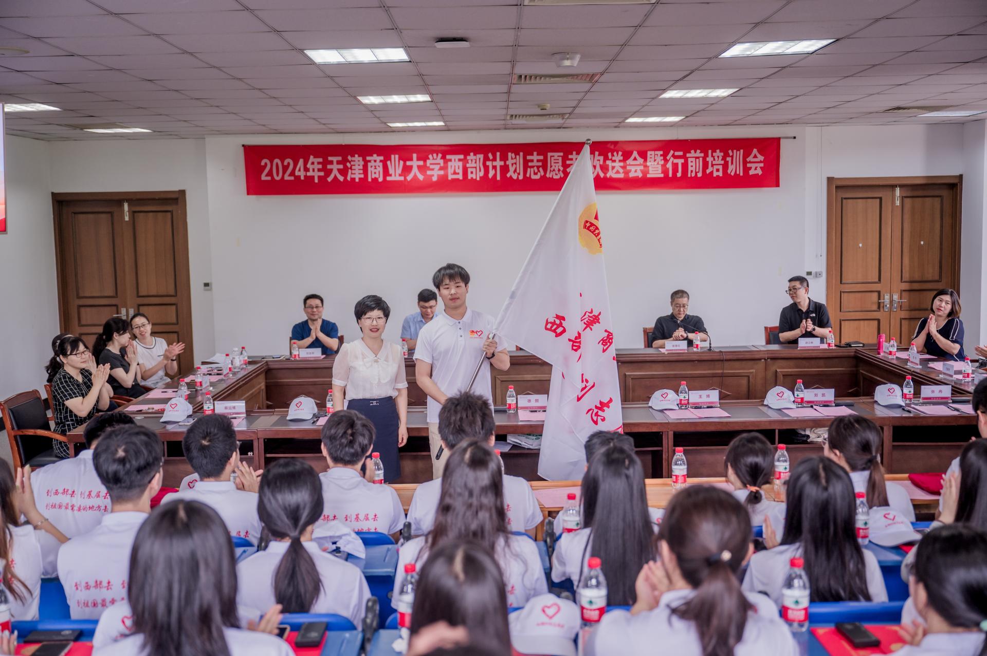 王立云向西部計劃志愿者授旗,對81名即將奔赴西部基層一線的志愿者們致以熱烈祝賀與誠摯祝愿,對同學們到西部去建功立業、貢獻青春力量表示高度贊賞,充分肯定了同學們志存高遠、勇于奉獻,用實際行動讓報國之志成為報國之行的崇高理想與追求。