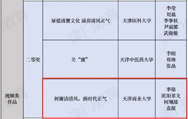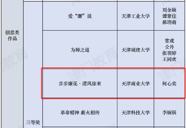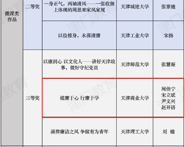 近日,由市教育兩委主辦,天津科技大學(xué)、天津現(xiàn)代職業(yè)技術(shù)學(xué)院承辦的“廉潔鑄魂強(qiáng)根本 挺膺奮進(jìn)建新功”第九屆天津高校廉潔教育系列活動成功舉辦。活動以面向全市高校征集廉潔教育主題相關(guān)作品及課堂實(shí)踐案例為主要內(nèi)容,共有來自46所高校的152件作品及課堂實(shí)踐案例入圍。我校《樹廉潔清風(fēng),揚(yáng)時代正氣》獲“視頻類作品”二等獎、《步步廉花?清風(fēng)徐來》獲“創(chuàng)意類作品”三等獎、《植廉于心 行廉于學(xué)》獲“微課類作品”三等獎。