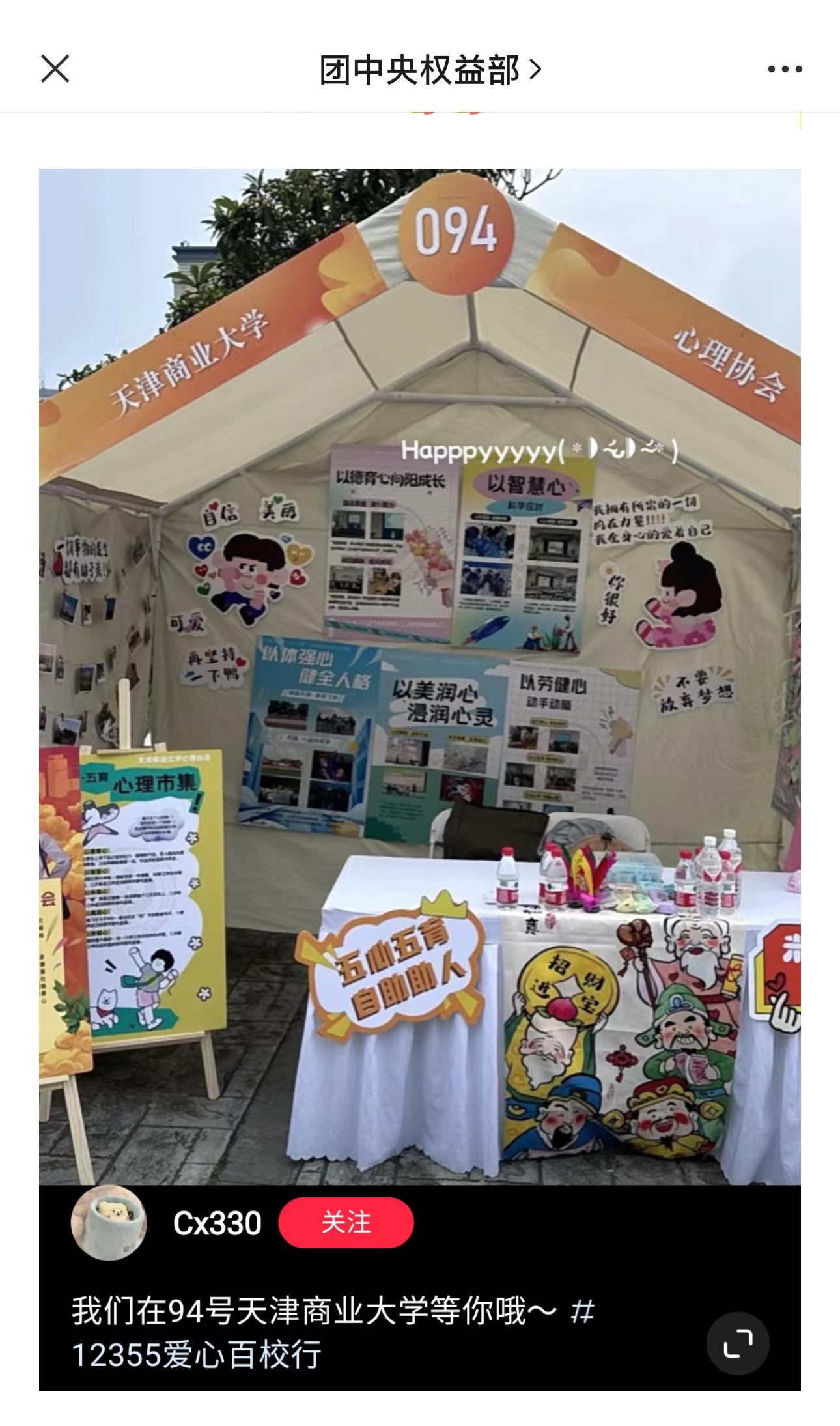 5月11日至12日,共青團中央部署開展的“12355愛‘心’百校行”活動在江蘇南京啟動,首站活動在南京審計大學舉辦,81家高校心理健康社團師生參加“心理市集”“青少年心理健康議題研討”“心理健康社團建設經驗分享”等活動。天津商業大學心理協會作為團中央維護青少年權益部、全國學聯秘書處、中國青年報社直接聯系培養的高校心理健康社團受邀參加,是唯一參加展演的天津市高校社團。