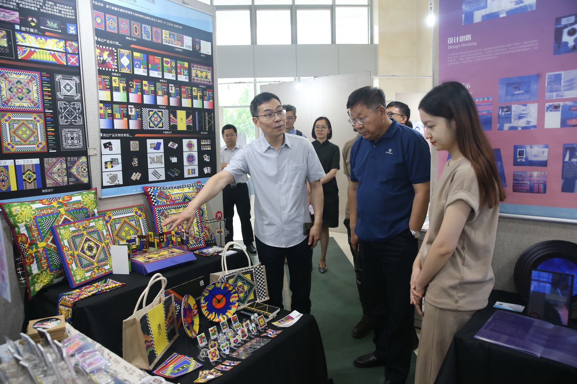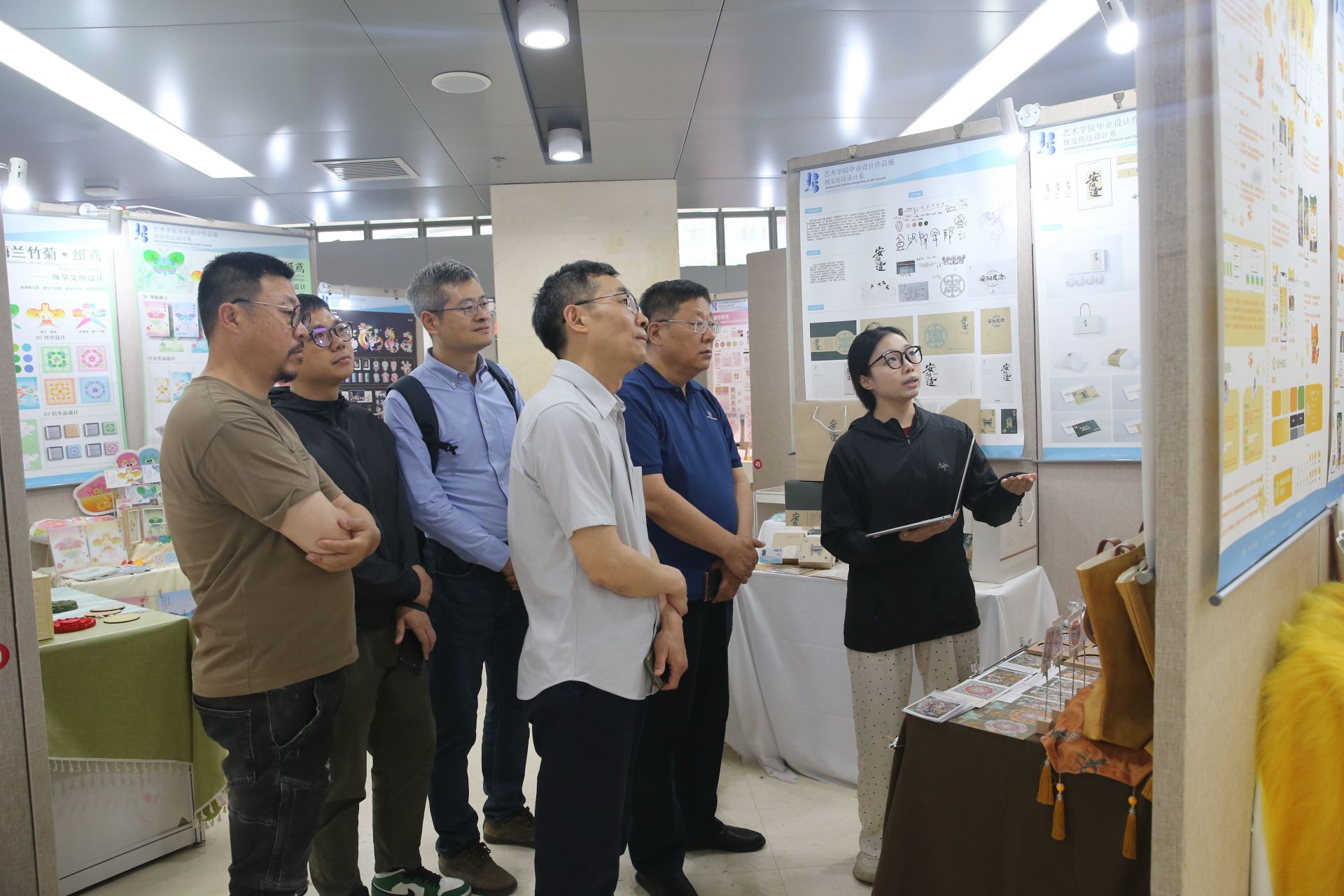 張亞、齊恩平在觀展過程中,逐一駐足觀賞各展區作品,認真聽取創作者對設計理念、工藝技法及文化內涵的闡述。在互動交流環節,校領導對畢業生將傳統文化元素與現代設計語言有機融合的創作方向表示高度肯定,特別指出本次展覽既體現了藝術教育的育人成果,更展現出青年學子對社會熱點的敏銳洞察,作品在藝術性、思想性與技術性層面均達到較高水準。