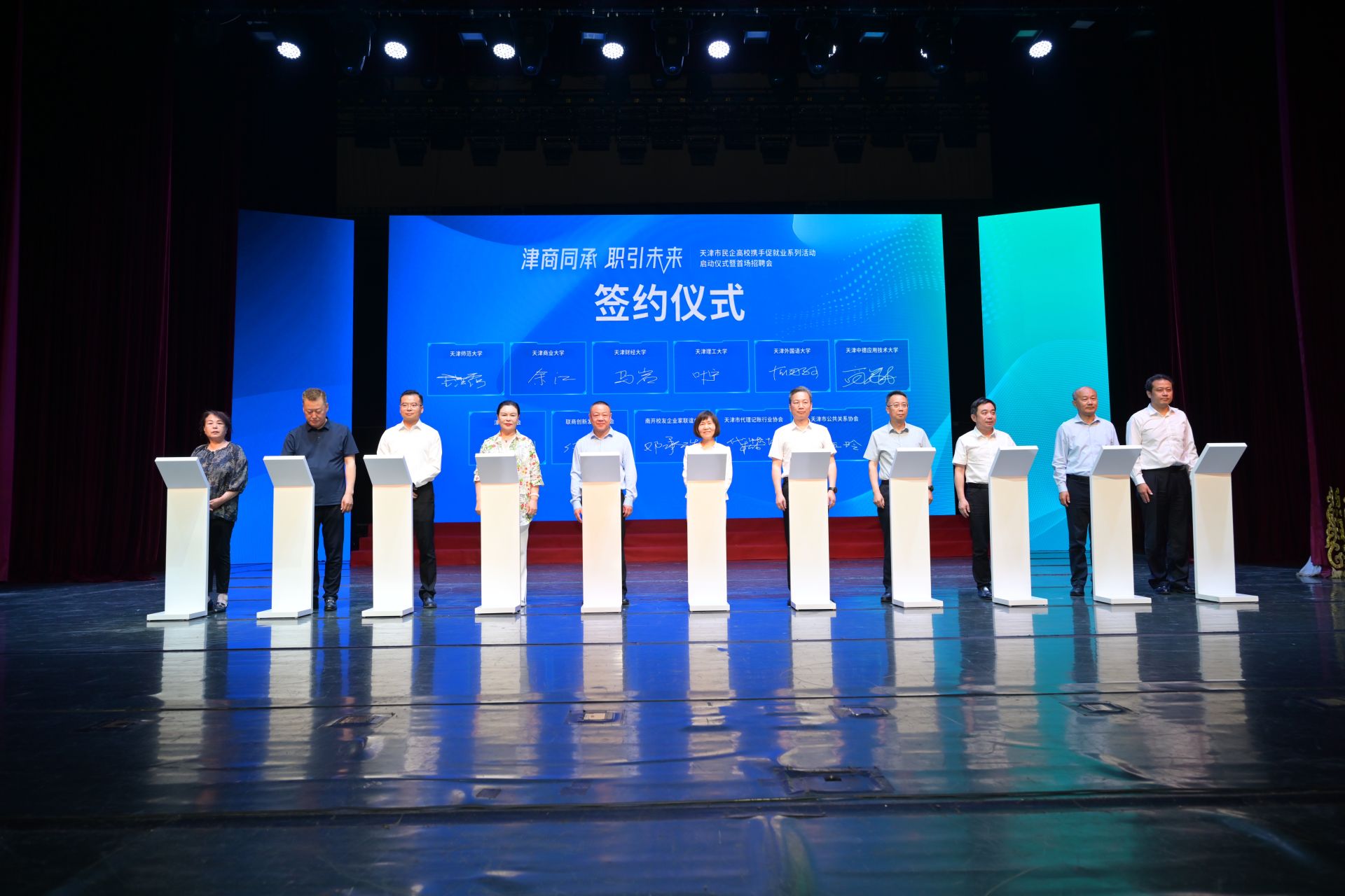 5月27日,由市委統(tǒng)戰(zhàn)部指導,市工商聯(lián)、市教委、市人社局、河西區(qū)人民政府主辦,津商聯(lián)合會等多家單位共同承辦的“津商同承 職引未來”天津市民企高校攜手促就業(yè)系列活動啟動儀式暨首場招聘會在中華劇院成功舉辦。副市長李文海,市工商聯(lián)主席、市總商會會長婁杰,市人社局黨組成員、副局長杜全勝,市委教育工委委員、市教委副主任郝奎剛,市工商聯(lián)專職副主席時錦霞,河西區(qū)委副書記、區(qū)長穆生軍,津商聯(lián)合會會長、物美集團創(chuàng)始人、多點DMALL創(chuàng)始人張文中等出席活動。我校受邀參加此次活動,副校長余江帶隊,法學院、黨委學工部主要負責同志及2025屆畢業(yè)生百余人參會。