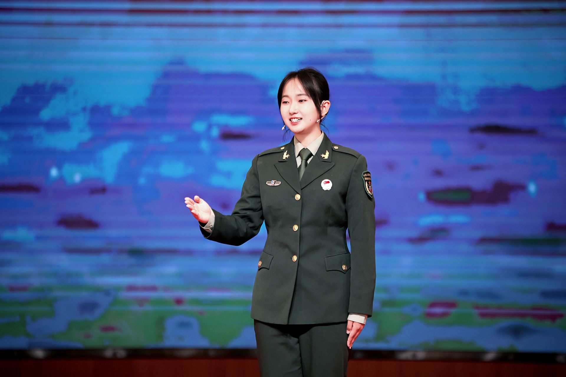 比賽現(xiàn)場(chǎng),張祎以“星河無聲處——和平年代里的青春站位”為題,運(yùn)用視頻、舞臺(tái)劇表演等形式,圍繞我黨革命伴侶——溫健公與宋維靜的英雄事跡,結(jié)合自身服役親身經(jīng)歷,緊扣“愛我國防”核心主題,以真摯情感和鮮活事例,深刻闡釋了把“個(gè)人的理想追求融入黨和國家事業(yè)之中”的青春奮斗之路。