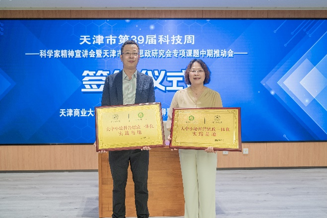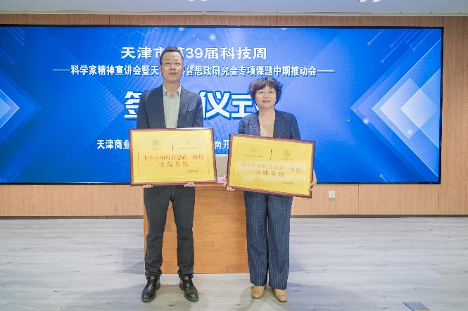活動現場,天津商業大學理學院與楊柳青第三中學、南開區五馬路小學簽署“大中小幼科普思政一體化實踐基地”合作協議。
