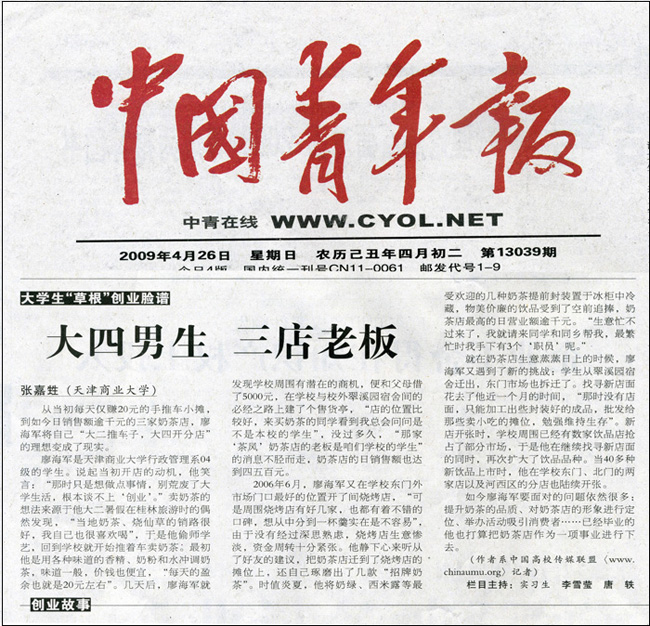 中國青年報報道我校04級學生廖海軍從擺攤到三店老板的創業故事(圖文)