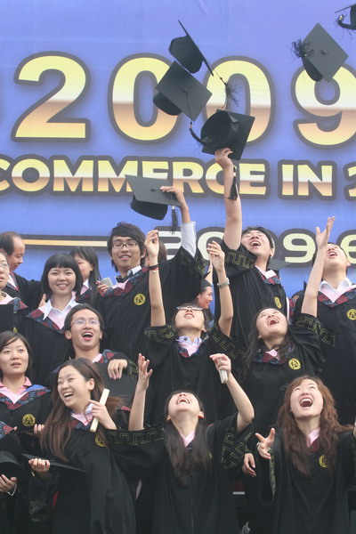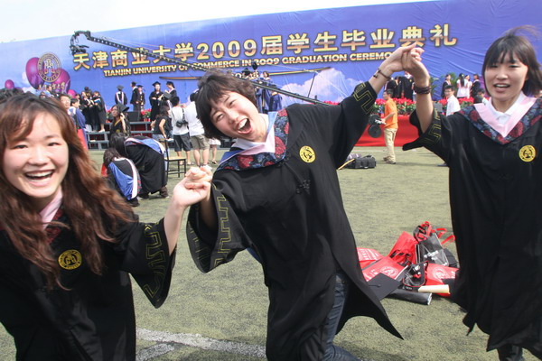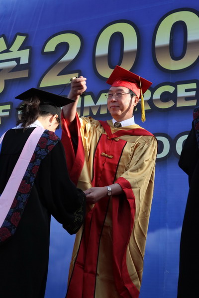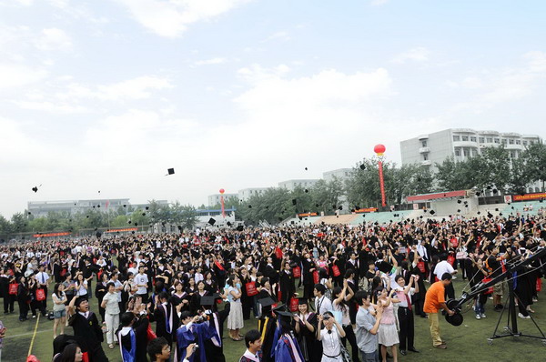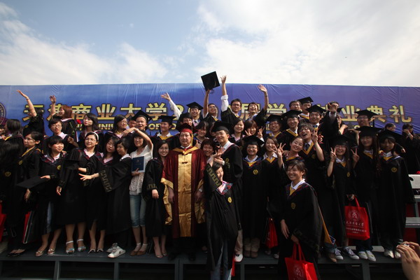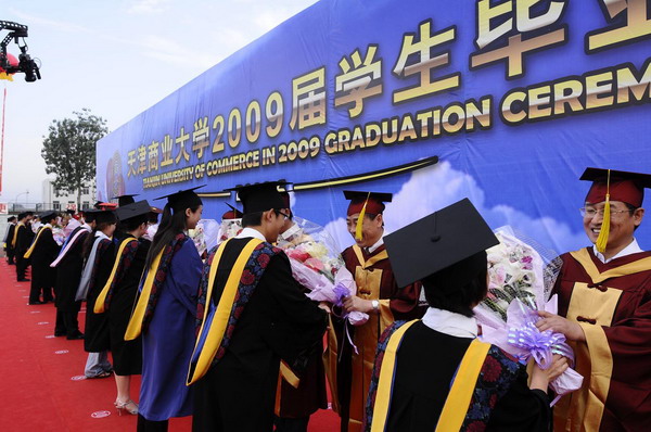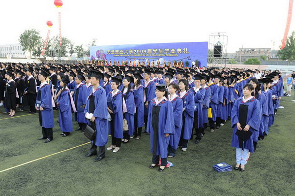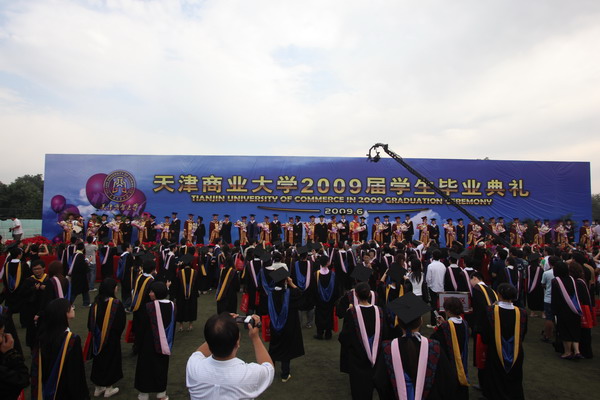 6月23日早6 點,天津商業大學 2009 屆學生畢業典禮在校足球場隆重舉行。30 米寬的典禮臺鋪滿嶄新的紅色地毯,180 平方米的藍色背景墻上“天津商業大學 2009 屆學生畢業典禮”幾個大字在朝陽中熠熠生輝,紅色的氫氣球、紅色的拱門、紅色的“一品紅”鮮花、紅色的條幅使典禮現場沉浸在喜慶的海洋中。校黨委書記陳學奇、校長劉書瀚,校黨委副書記楊萬義、史習紅,副校長魏胤亭、馬三津,及校長助理、教務處長、研究生部主任、各專業學院院長等 23 位導師身著導師服出席典禮, 300 余名家長前來觀禮,共同見證 2009 屆 2937 名學生順利完成學業,即將翻開人生新的篇章這一美好而幸福的時刻。典禮由學工部部長賈青主持。
