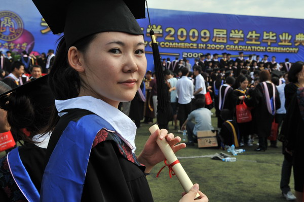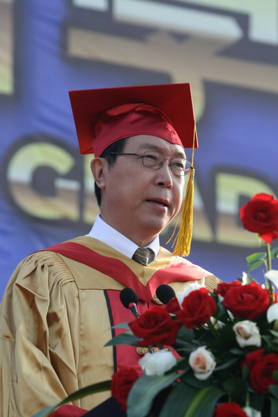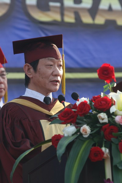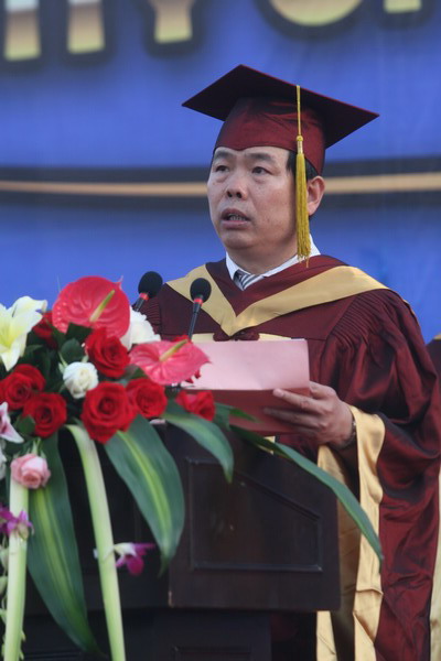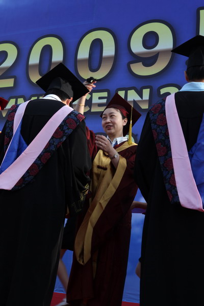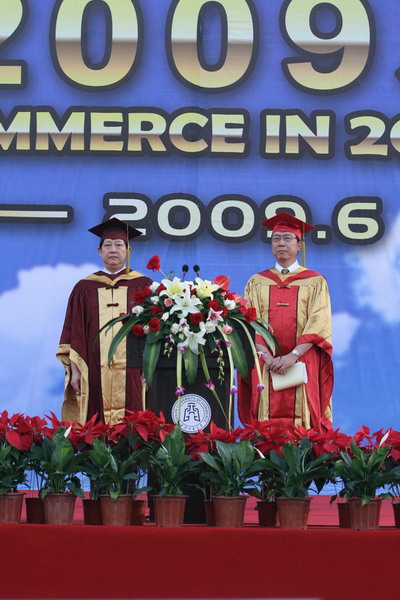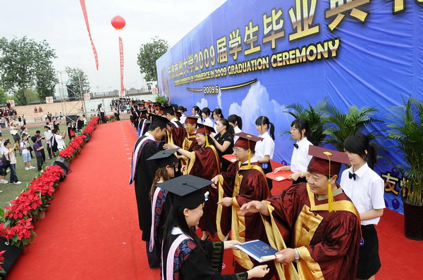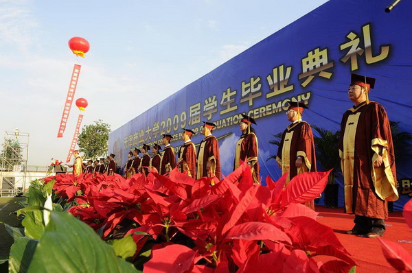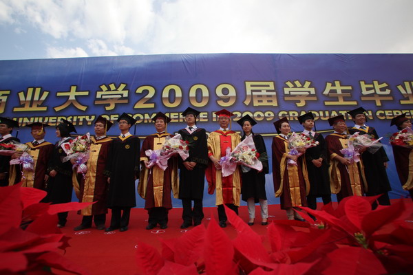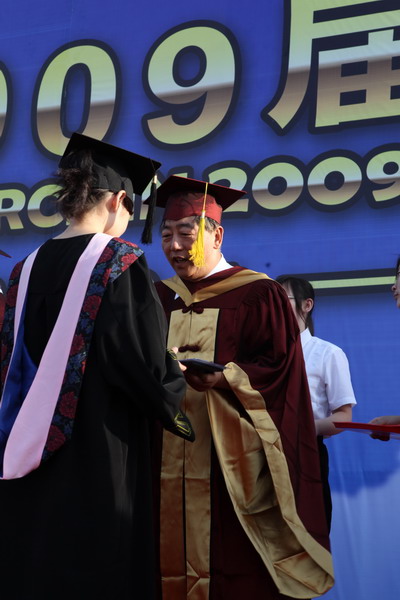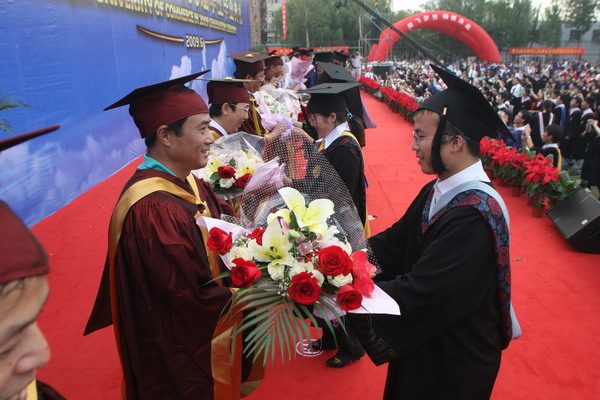 畢業典禮在莊嚴的國歌聲中開始。校黨委副書記楊萬義宣讀對志愿服務西部學生的表彰決定。副校長魏胤亭代表校畢業資格審查委員會和學位委員會宣布 2009 屆學生畢業資格審查和學位授予結果。劉書瀚校長發表熱情洋溢的講話,對 2009 屆學業有成的畢業生表示祝賀并鼓勵他們在人生新的征程中要“誠信立世,奉獻于人;博學重踐,銳意創新;心系母校,共求發展。”