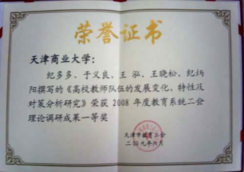 2008 年天津市教育工會系統開展了優秀理論調研成果征集評選活動,共有 54 篇理論研究成果入選,其中一等獎 10 篇,二等獎 15 篇,三等獎 18 篇,優秀獎 11 篇。我校由紀多多、于義良、王泓、王曉松、紀炳陽組成的工會理論調研課題組以《高校教師隊伍的發展變化、特性及對策分析研究》獲得優秀調研理論成果一等獎。這充分反映了我校各級工會干部及教職工在學習實踐科學發展觀活動中,理論學習與研究方面取得的成果,為進一步推動工會工作的理論創新和實踐創造發揮積極作用。