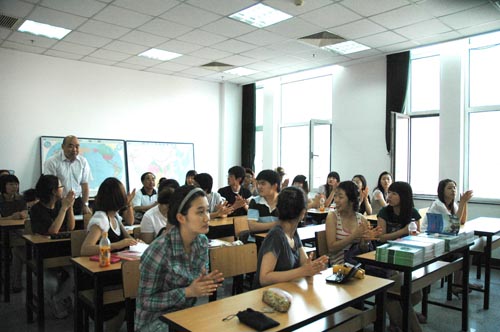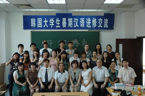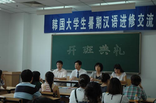 7 月1 日 ,國際教育學院迎來了 2009 暑期第一個訪問團——來自韓國國立忠北大學、忠清大學、韓中文化教育院的 19 名在校大學生來我校進行暑期漢語進修。 7月3 日 ,進修班舉行了開班典禮。國際教育學院領導寇小萱、鄭志明,留學生管理人員,漢語教學教師參加了典禮。寇小萱院長代表學院講話,她對學員們的到來表示歡迎,希望同學們在炎熱的夏季注意身體健康,取得理想的交流與進修效果。教師代表王立杰,學生代表鄭娜麗分別發言。