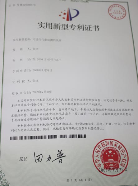 校團委在 2007 年 10 月— 12 月開展首屆文化創(chuàng)意大賽,賽后積極與天津市知識產(chǎn)權局聯(lián)系,免除大部分申報專利費用,鼓勵參賽選手申報專利,經(jīng)過國家知識產(chǎn)權局一年的審核,我校經(jīng)濟學院金融 061 班張文同學的作品《可進行氣象監(jiān)測的風箏》于 2009 年 7 月 29 日 獲得授權,專利號為: ZL 2008 2 0075732.7 。
