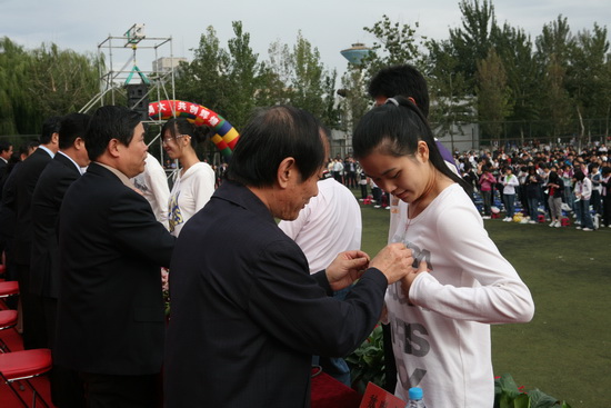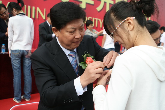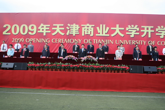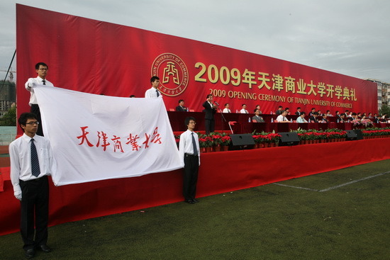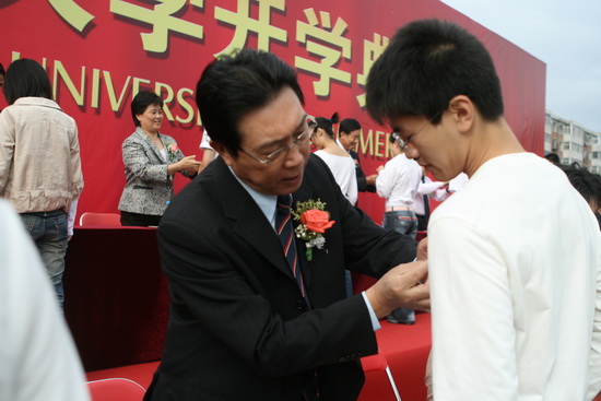開學(xué)典禮在莊嚴(yán)的國歌聲中開始。 2009 級學(xué)生工商管理類施崴代表全體新生發(fā)言。隨后,校領(lǐng)導(dǎo)為 2009 級新生代表佩戴校徽。3900余新生戴上校徽舉起右手向校旗莊嚴(yán)宣誓。