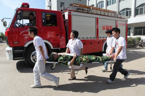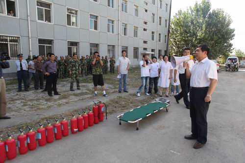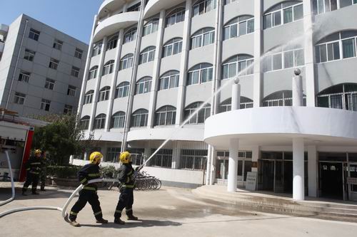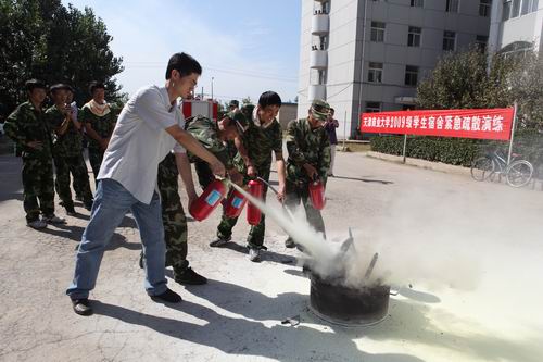 公安消防 43 中隊出動一部消防車,現場進行了滅火表演;北辰消防支隊領導現場講解了滅火器的使用方法并實際操作示范; 2009 級學生、宿舍管理人員、軍訓教官,親身體驗用滅火器滅火。