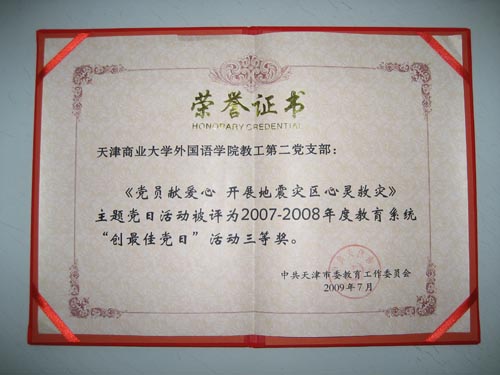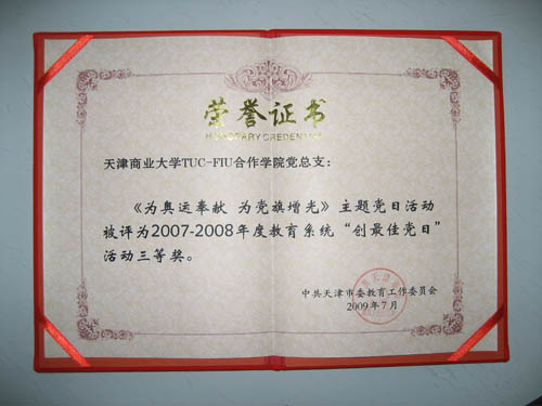 在此基礎上,學校向教育工委上報了我校“創最佳黨日”活動開展情況,并推薦部分活動參與教育工委“創最佳黨日”活動評比。經過教育工委的認真評議, TUC — FIU 合作學院的“為奧運奉獻,為黨旗增光”、外國語學院的“黨員獻愛心,開展地震災區心靈救災”被評為 2007-2008 年度教育系統“創最佳黨日”活動三等獎。