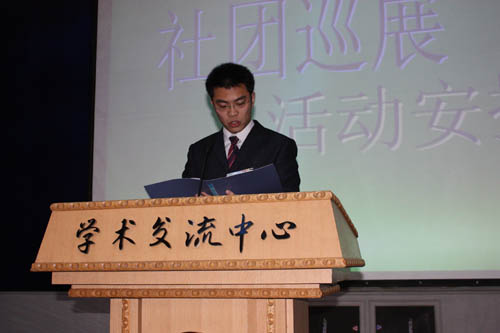 校社團聯合會主席周曉寧致開幕詞。她表示,學校社團有利于同學們豐富生活、完善人格,為同學們展示自我提供平臺,希望校園社團能越辦越好。開幕式上,社團聯合會執行主席楊陽介紹了本屆社團巡展活動的安排:在 11 月至 12 月,各個社團的精彩活動將輪番上陣,模擬法庭、炒股大賽、職場沙龍、街舞魔術……冬日的校園文化生活將會豐富多彩。社團代表校辯論社社長孫傲發言,他表示,社團活動正努力向知識性、學術性、趣味性、思想性靠攏,社團也在走向規范化、特色化、品質化。南開大學社團聯合會常務副主席李妍作為嘉賓發言,她肯定了我校社團的發展,希望全市各兄弟院校社團能夠相互幫助,加強交流與合作。同學們觀看了我校 90 多個社團在過去一年中的精彩活動 DV 展示。