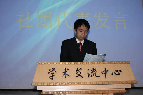 校黨委副書記楊萬義講話。他肯定了我校一些社團取得的驕人成績,指出我校社團作為培養學生興趣愛好、繁榮校園文化生活的第二課堂,已經成為大學生豐富校園生活、參與學校活動、延伸求知領域、擴大交往范圍的一種重要方式,各社團以自身特有的思想性、藝術性、知識性、趣味性、多樣性,吸引著廣大青年學生積極參與。他還向廣大同學提出三點希望:一是要不斷辦好社團活動,提高活動的覆蓋面,吸引更多同學參加到社團里來;二是要在社團活動設計上下功夫,提高社團活動質量;三是社團活動要不斷創新,同時要積極把社團活動與社會實踐活動結合起來。