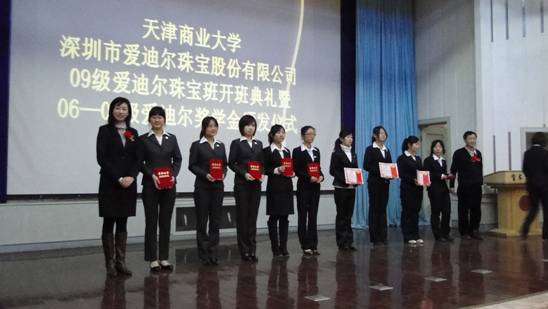 11 月 23 日 上午,我校 2009 級愛迪爾珠寶班開班典禮暨 06 — 08 級愛迪爾珠寶班獎學金頒獎儀式在我校學術交流中心舉行。