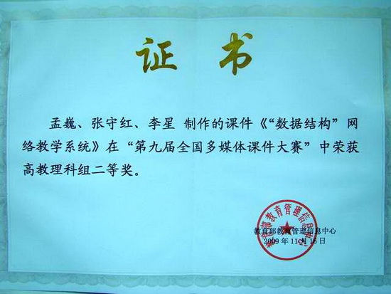近日,在“第九屆全國多媒體課件大賽”中,由信息工程學院計算機系講師孟巍主持開發的多媒體課件《〈數據結構〉網絡教學系統》榮獲高教理科組二等獎。