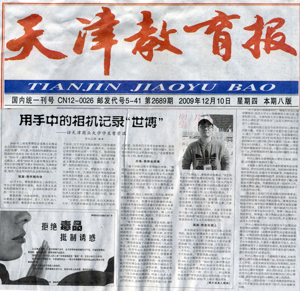 天津教育報報道我校學生曹景淇用手中的相機記錄“世博”的報導(圖文)