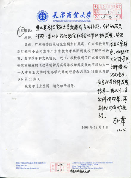 日前, 市委常委、市委教育工委書記茍利軍對我校今后的工作作出重要批示。此批示是在廣東省委政策研究室副主任莫震、廣東省教育廳副廳長葉小山同志率廣東省教育考察團到我校了解學校教育、教學改革和發展情況后,形成了《改革創新是高等學??缭桨l展的不竭動力—天津商業大學特色辦學之路的經驗和啟示》的調研報告。茍利軍書記閱后作出批示。