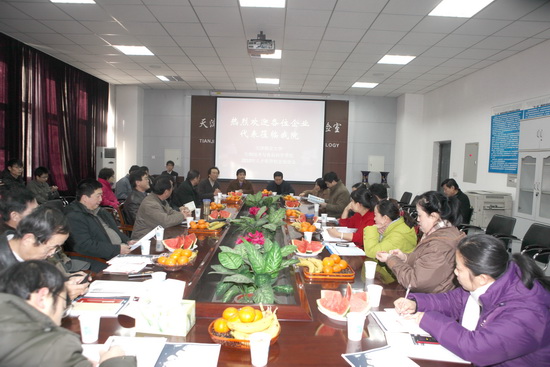 12 月 18 日上午,為進一步貫徹學校辦學指導思想和特色人才培養戰略,加強學校與企業的交流,為 2010 屆畢業生搭建就業平臺,生物技術與食品科學學院與學院會議室召開了首屆人才培養校企座談會。共邀請到天津海河乳業、天津中辰番茄制品有限公司、天成制藥有限公司、天津樂仁堂制藥廠和桂順齋等 25 家優秀企業相關負責人到會。學校招生就業辦、學院領導與部分教師及畢業生代表30余人參加了此次座談會。校黨委副書記楊萬義親臨會場并講話。學院黨總支副書記孫文利主持座談會。