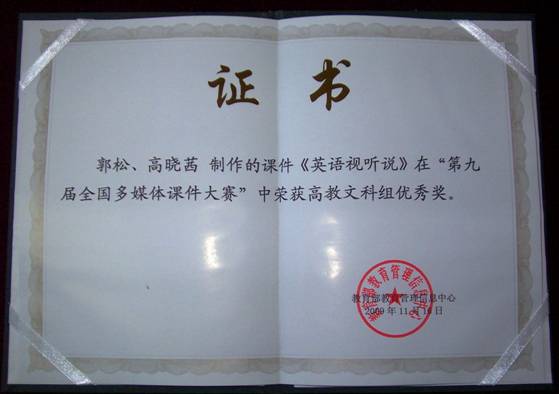 近日,在 “ 第九屆全國多媒體課件大賽 ” 中,外國語學院英語系講師郭松和高曉茜制作的《英語視聽說》多媒體課件榮獲高教文科組優秀獎。教育部教育管理信息中心為此頒發了證書。