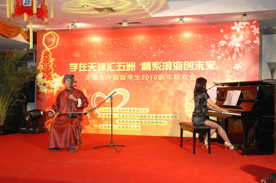 12 月 23 日 ,市教育委員會在天津師范大學舉辦了“天津市外國留學生 2010 年新年聯歡會”。 我校國際教育學院韓國留學生奇正林、楊楊以二胡、鋼琴中西合璧的形式演奏了意大利名曲《愛情的喜悅》,展示了我校留學生的風采。