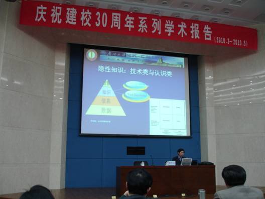 柯平教授在報告中,闡述了關于隱性知識、知識資本、知識管理的技術問題、知識管理的文化問題、企業知識管理等十個有關知識管理前沿問題。柯教授的報告內容豐富,旁征博引,深入淺出,精彩紛呈,具有很強的理論研究和實踐指導意義,使大家受益匪淺,博得了與會廣大師生的熱烈掌聲。