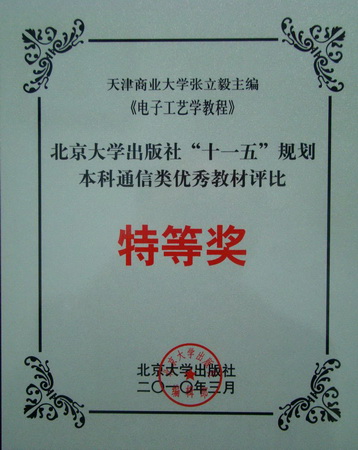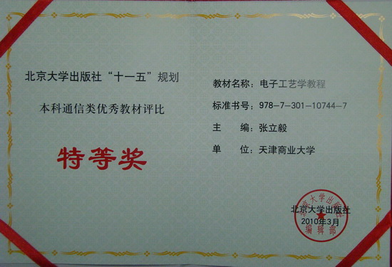 近日 ,在北京大學出版社召開的2010年度電氣信息類優秀教材評獎修訂會上,由我校信息工程學院院長張立毅教授主編的教材《電子工藝學教程》,獲得北京大學出版社“十一五”規劃本科通信類優秀教材評比特等獎。