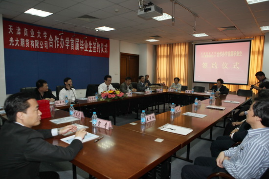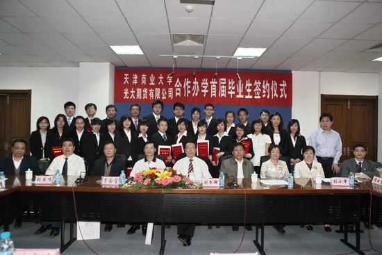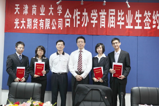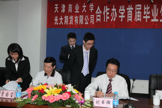 光大期貨有限公司總經理曹國寶、天津市證監局副局級巡視員張書鳴和市教委高教處副處長穆樹發分別講話,他們都對我校光大期貨班的培養模式給予了高度的贊揚,對順利簽約的畢業生表示祝賀,并希望我校光大期貨班越辦越好。最后,校長劉書瀚、光大期貨有限公司總經理曹國寶以及簽約學生在畢業生的就業三方協議上簽字。