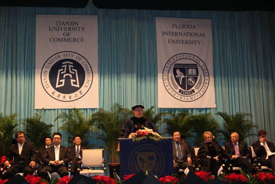美國(guó)佛羅里達(dá)國(guó)際大學(xué)校長(zhǎng)Mark B. Rosenberg在致辭中說(shuō),他很高興能參加這次畢業(yè)典禮,并祝賀全體畢業(yè)生通過(guò)自身的努力擁有了參與國(guó)際競(jìng)爭(zhēng)的資本。他充分肯定了我校酒店管理專(zhuān)業(yè)的人才培養(yǎng)模式,并表示FIU將與我校繼續(xù)合作,進(jìn)一步開(kāi)辦酒店碩士、探討其他專(zhuān)業(yè)的合作項(xiàng)目、舉辦FIU天津美食節(jié)等活動(dòng)。最后,他對(duì)畢業(yè)生提出了三點(diǎn)希望:以母校為榮、宣傳母校、支持母校。