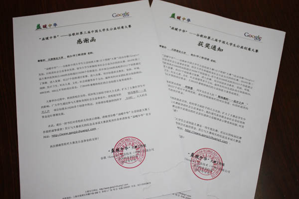 在剛剛結束的第三屆谷歌公益創意大賽中,我校科技協會指導的何怡萱、王勝、楊嵐、滕顯波、譚添文、馬銘、喬露洋、陳秋瓊 8 名同學組成的團隊從來自全國 1060 所高校的 18200 支隊伍中脫穎而出,其公益創意“特崗教師——花開之聲”項目經過在預賽、復賽和決賽后,在進入決賽的 227 個項目中取得優勝,得到公益獎金 31507 元,并將與來自全國其他高校的 30 支團隊的繼續努力,將公益創意方案變成現實。