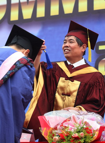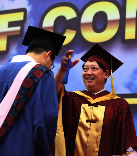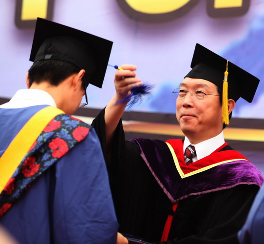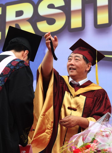 校黨委書記陳學奇為畢業生頒發畢業證書和學位證書并撥流蘇