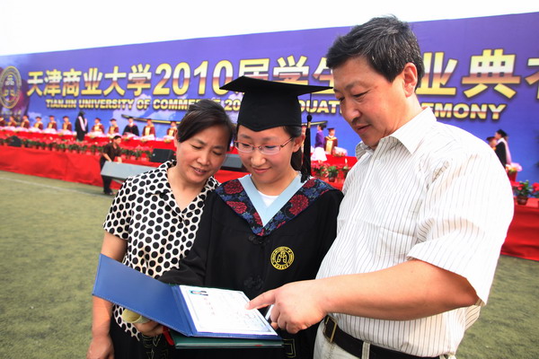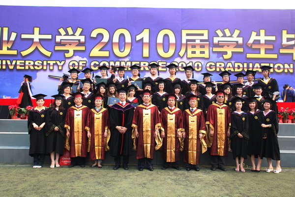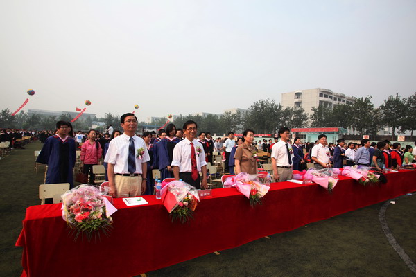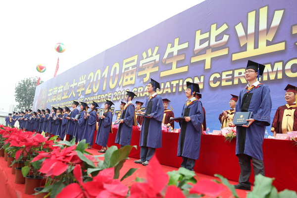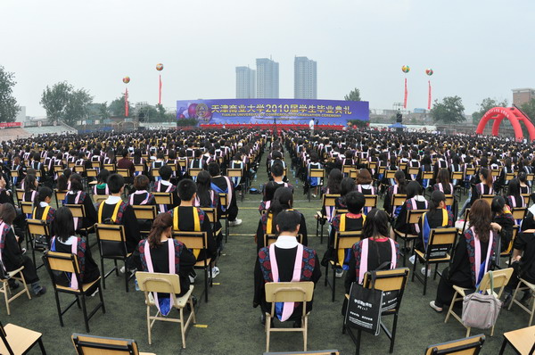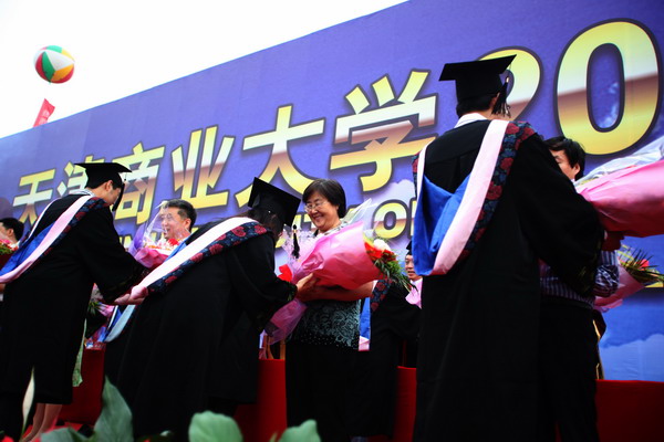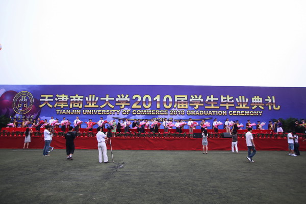 6 月 22 日 早 6 點,我校 2010 屆學生畢業典禮在校足球場隆重舉行。 40 米寬的典禮臺鋪滿嶄新的紅色地毯, 240 平方米的藍色背景墻上“天津商業大學 2010 屆學生畢業典禮”幾個大字在朝陽中熠熠生輝,紅色的氣球、紅色的拱門、紅色的“一品紅”鮮花、紅色的條幅使典禮現場沉浸在喜慶的海洋中。校黨委書記陳學奇、校長劉書瀚,校黨委副書記楊萬義、史習紅,副校長魏胤亭、馬三津,校紀委書記路波及校長助理、教務處長、研究生部主任、各專業學院院長等 24 位導師身著導師服出席典禮,優秀教師代表、各學院書記、副書記、全體輔導員班主任參加典禮, 200 余名家長前來觀禮,共同見證 2010 屆 2986 名學生順利完成學業,即將翻開人生新的篇章這一美好而幸福的時刻。