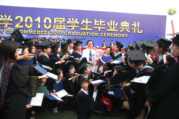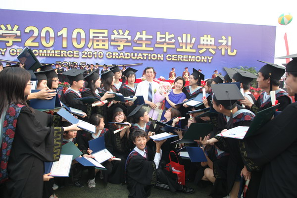 商學院林浩同學、機械工程學院韓楊同學代表 2010 屆全體畢業生發言,深情表達了對母校的無限眷戀和對未來的美好憧憬, 40 位教師代表在典禮臺上接受了 2010 屆全體畢業生對所有老師的無盡感激和深深祝福。畢業生代表用獻給導師和教師代表的一束束鮮花,表達出了內心對四年來老師為他們成長成熟付出心血與汗水,學校為他們成人成才做出改革與實踐的最誠摯的謝意。