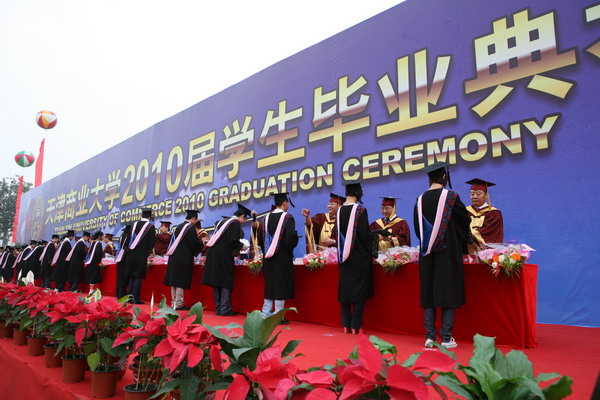 畢業典禮在莊嚴的國歌聲中開始。副校長魏胤亭代表校畢業資格審查委員會和學位委員會宣布 2010 屆學生畢業資格審查和學位授予結果。劉書瀚校長發表了熱情洋溢的講話,對 2010 屆學業有成的畢業生表示祝賀并鼓勵他們在人生新的征程中要“誠信立世,奉獻于人;博學重踐,銳意創新;心系母校,共求發展。”