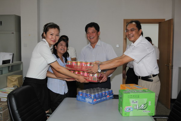 校黨委書記陳學奇、紀委書記路波為堅守崗位的職工送去消暑飲料
